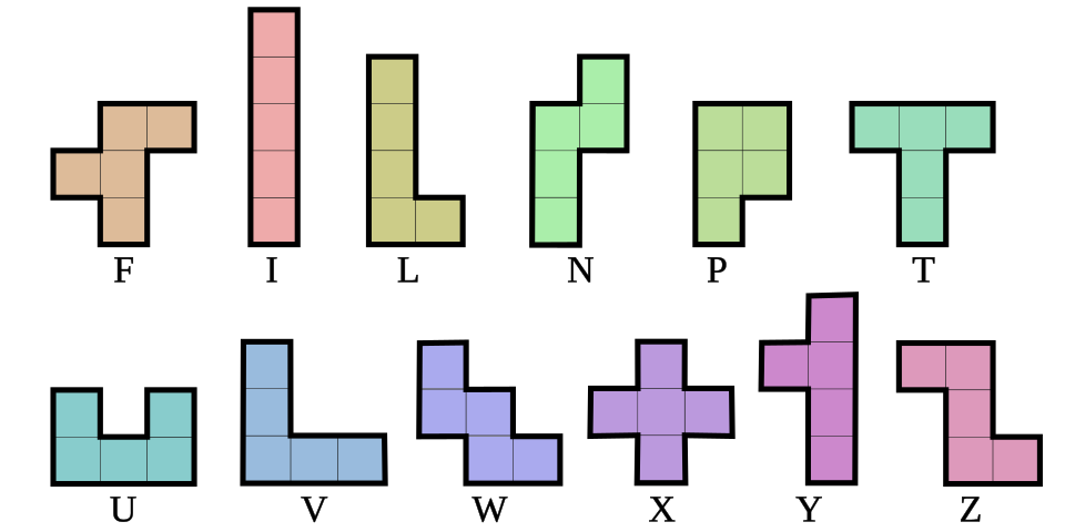 - The 12 Pentominoes: There are exactly 12 distinct pentominoes, considering rotations and reflections as the same shape. They are commonly named after letters they resemble: F, I, L, N, P, T, U, V, W, X, Y, Z.